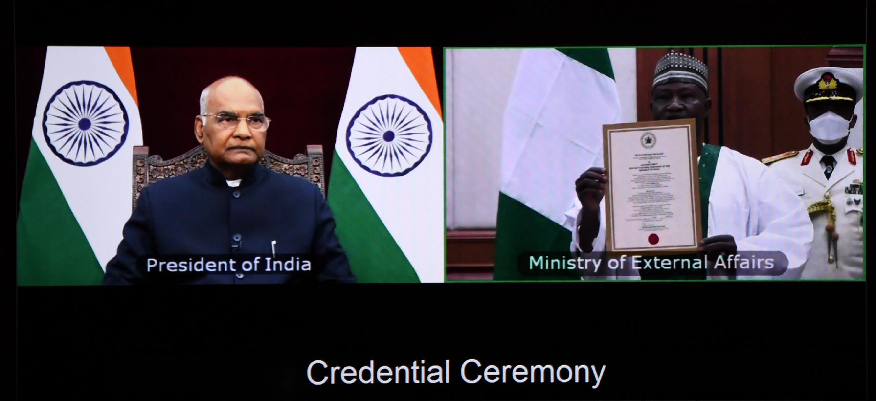 The President of India, Shri Ram Nath Kovind accepting credentials from the High Commissioner of the Federal Republic of Nigeria, H.E. Mr. Ahmed Sule, in a virtual ceremony, at Rashtrapati Bhavan on August 18, 2021.