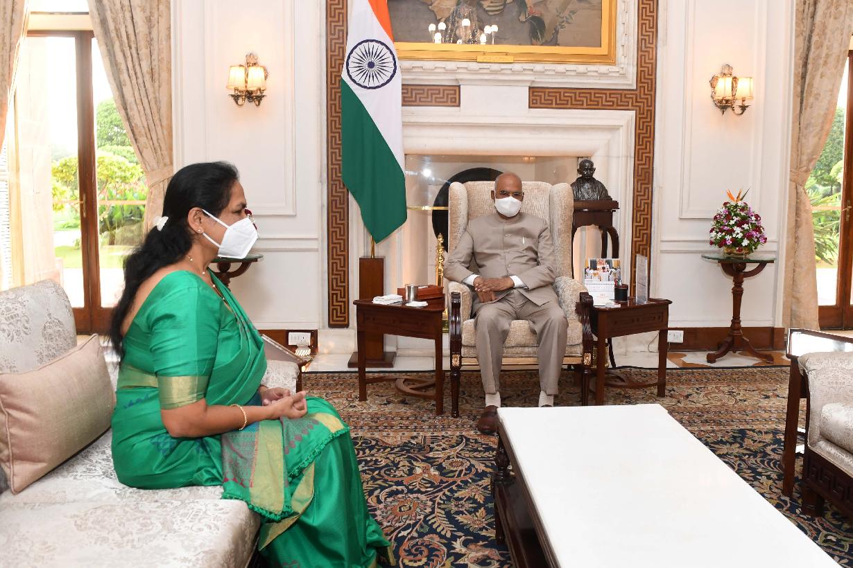 The Minister of State for Agriculture and Farmers Welfare, Ms. Shobha Karandlaje calling on the President of India, Shri Ram Nath Kovind, at Rashtrapati Bhavan on August 12, 2021.