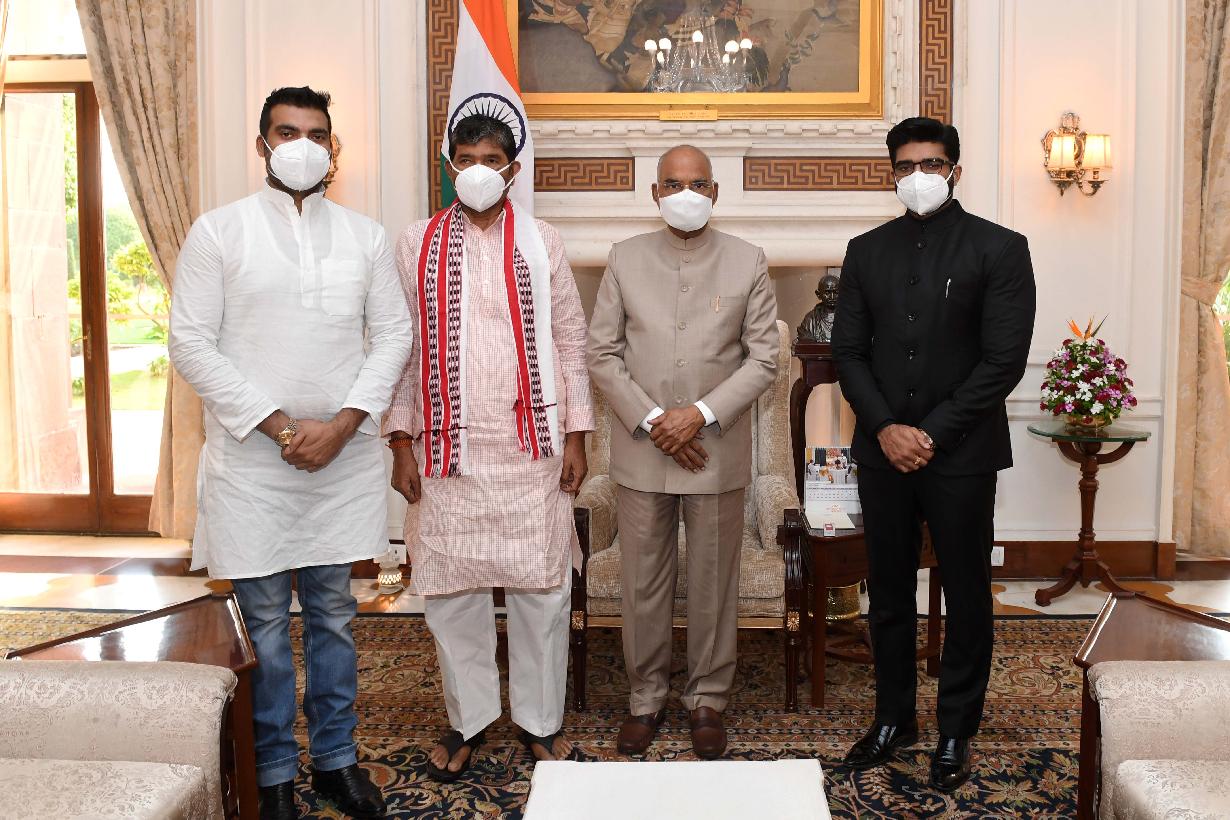 The Minister of Social Justice and Empowerment, Dr. Virendra Kumar with others calling on the President of India, Shri Ram Nath Kovind, at Rashtrapati Bhavan on August 12, 2021.
