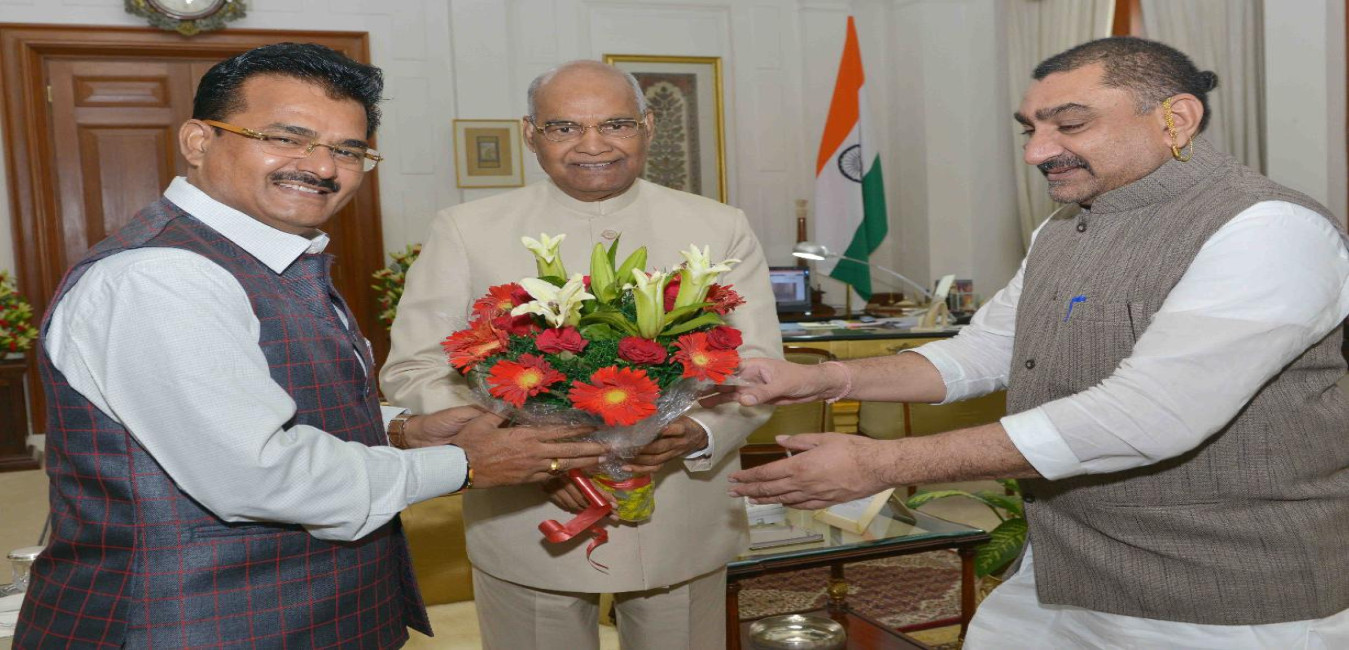 Shri Shambhunath Tundiya, MP (RS) and Dr. Jivaji Chauhan, State Secretary, BJP State meeting with the President of India, Shri Ram Nath Kovind, at Rashtrapati Bhavan on September 13, 2017.