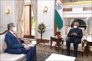 The Minister of Health and Family Welfare and Chemicals and Fertilizers, Shri Mansukh Mandaviya calling on the President of India, Shri Ram Nath Kovind, at Rashtrapati Bhavan on July 29, 2021.