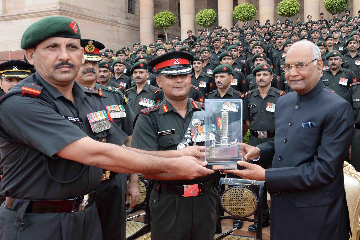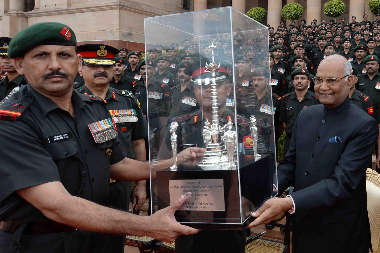 The President of India, Shri Ram Nath Kovind being presented the Battalion Memento by the Commanding Officer, 8 JAK LI (Siachen), at Rashtrapati Bhavan on August 26, 2017.