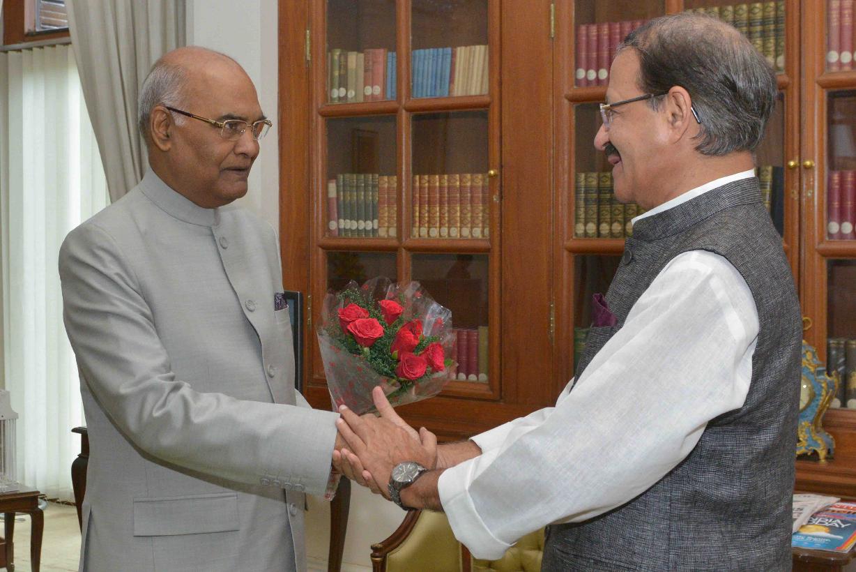 The Minister of Human Resource Development, Shri Prakash Javadekar meeting with the President of India, Shri Ram Nath Kovind, at Rashtrapati Bhavan on August 28, 2017.