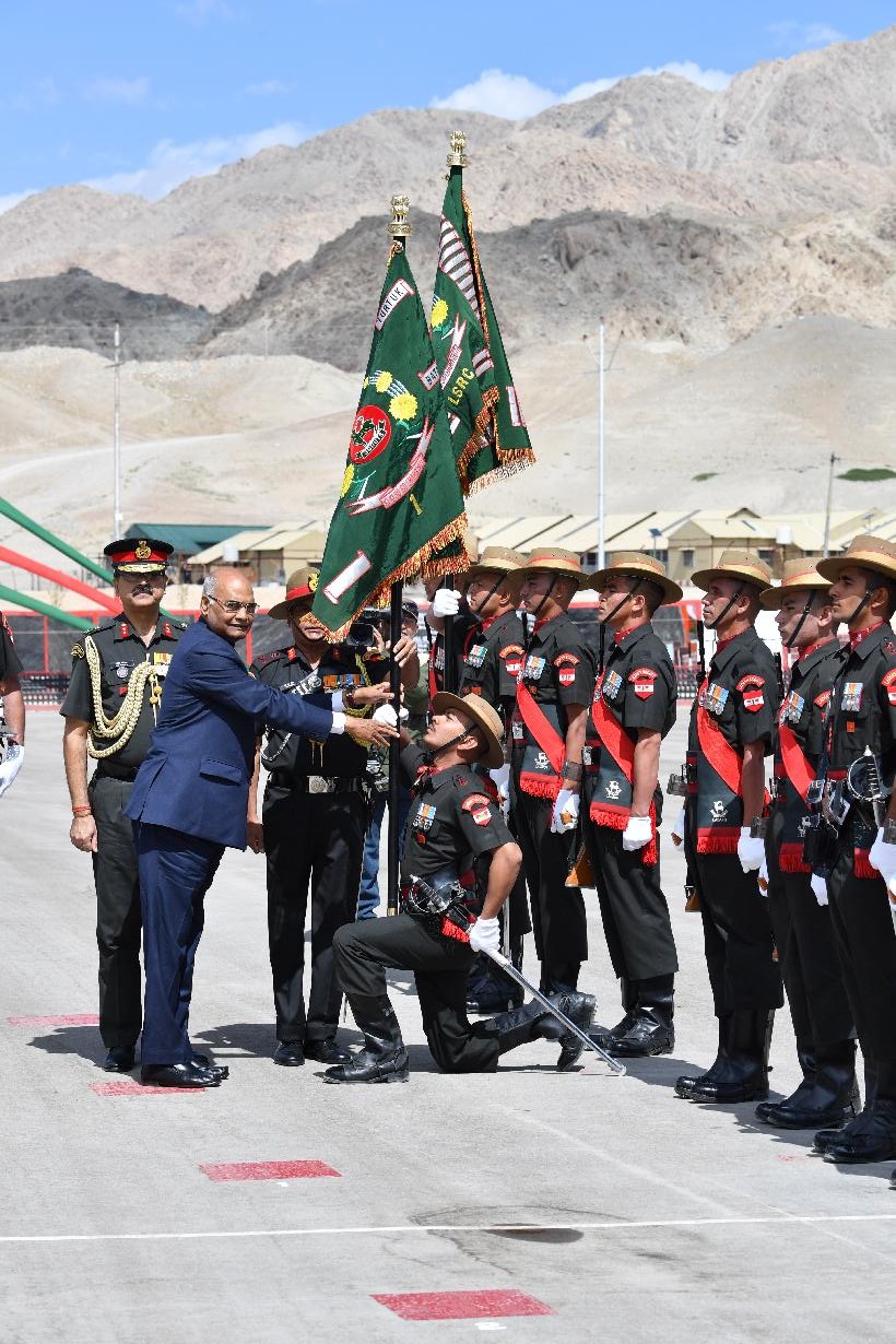 The President of India, Shri Ram Nath Kovind presenting the President s Colours to all five Ladakh Scouts Battalions and Ladakh Scouts Regimental Centre, at Leh, in Jammu & Kashmir on August 21, 2017.