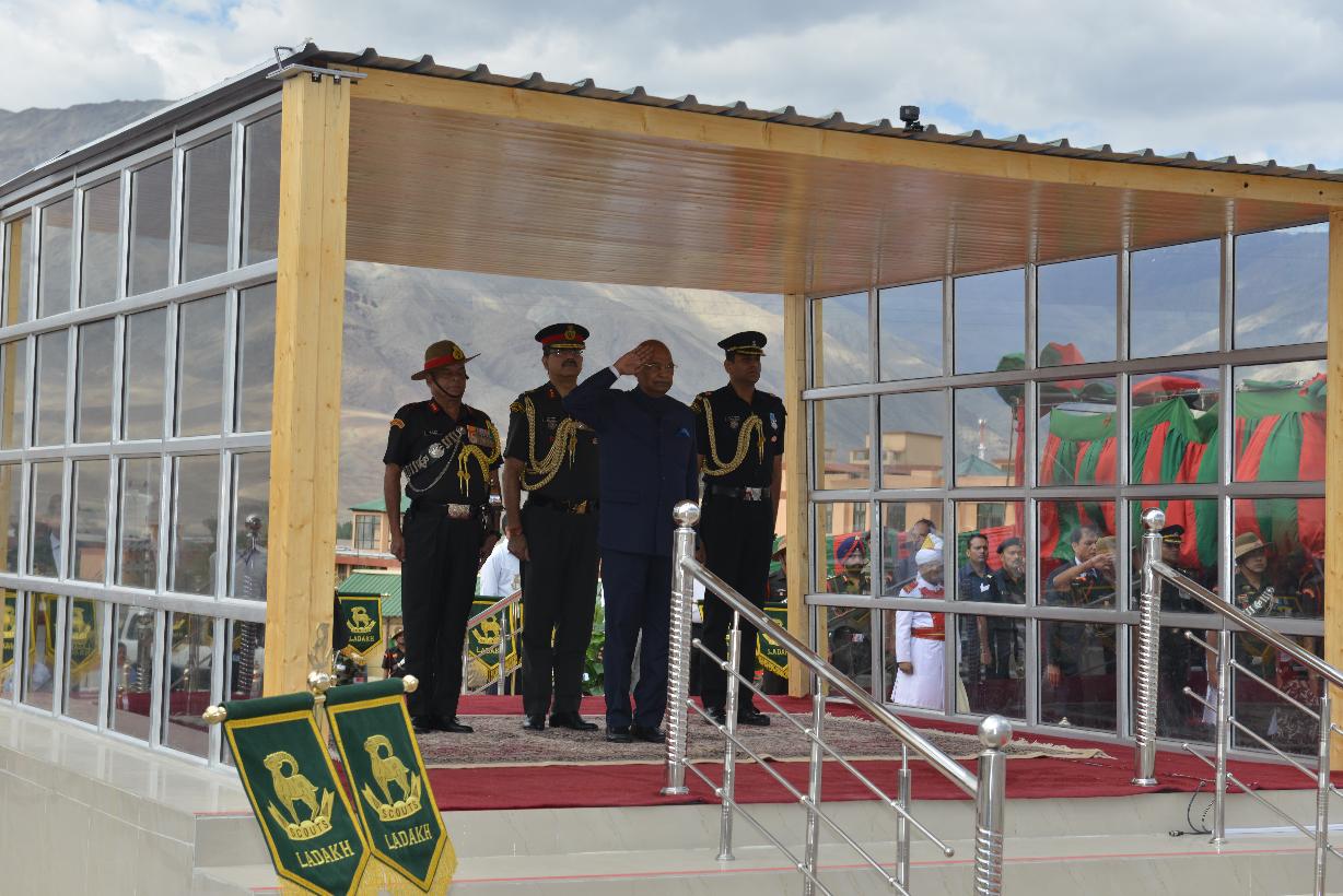 The President of India, Shri Ram Nath Kovind receiving the Rashtriya Salute and reviewing the Parade, at the presentation of the President s Colours to all five Ladakh Scouts Battalions and Ladakh Scouts Regimental Centre, at Leh, in Jammu & Kashmir on August 21, 2017.
