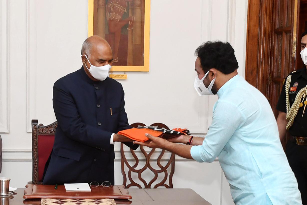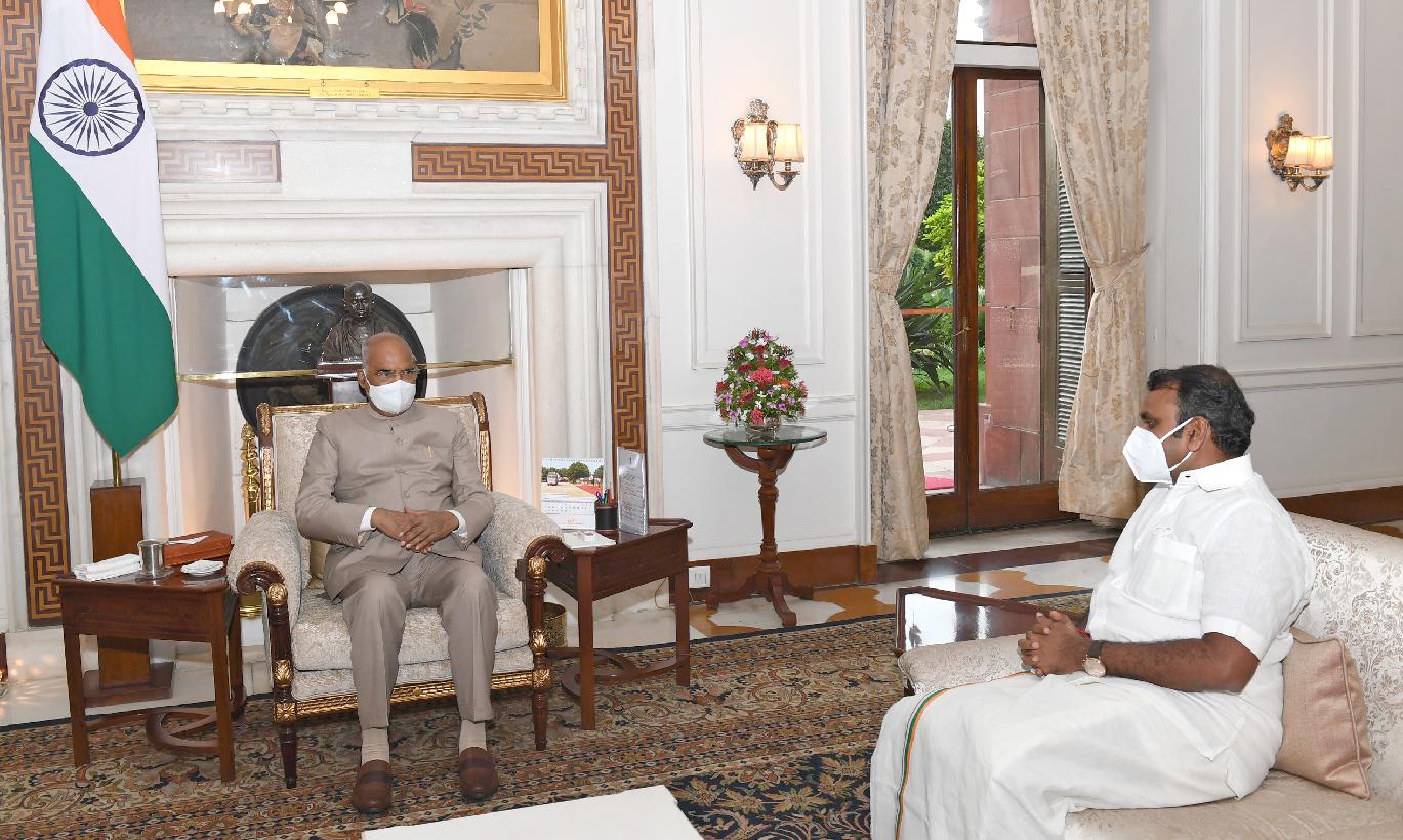 The Minister of State for Information & Broadcasting and Fisheries, Animal Husbandry & Dairying, Dr. L. Murugan calling on the President of India, Shri Ram Nath Kovind, at Rashtrapati Bhavan on July 22, 2021.