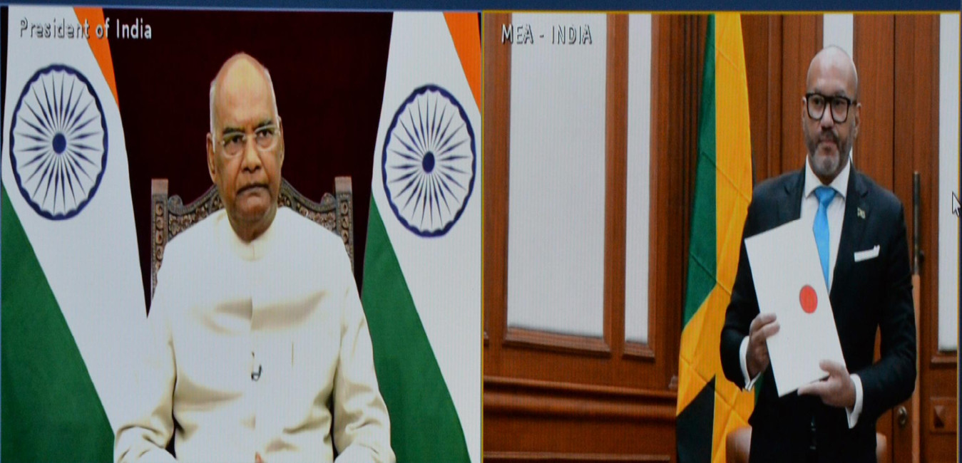 The President of India, Shri Ram Nath Kovind accepting credentials from the High Commissioner of Jamaica, H.E. Mr. Jason Keats Matthew Hall, in a virtual ceremony, at Rashtrapati Bhavan on July 06, 2021.