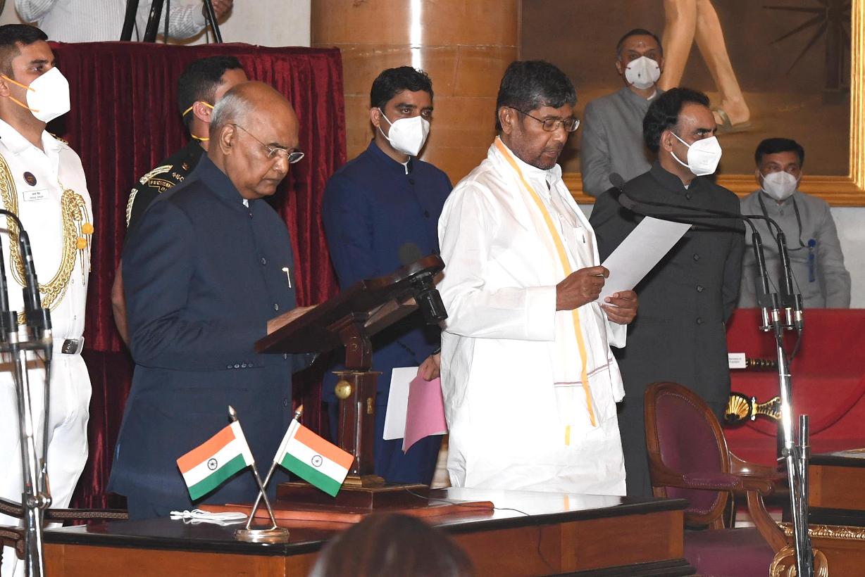 The President of India, Shri Ram Nath Kovind administering oath of office and secrecy to the members of Council of Ministers, at a swearing-in ceremony, at Rashtrapati Bhavan on July 07, 2021.
