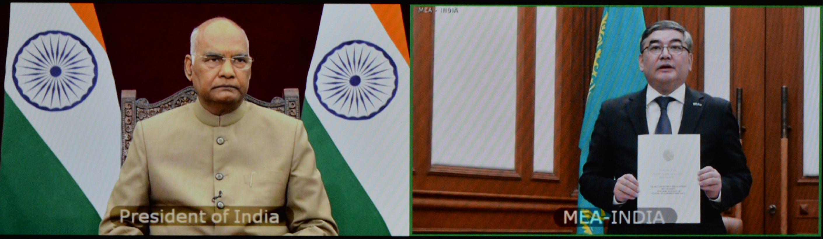 The President of India, Shri Ram Nath Kovind accepting credentials from the Ambassador of the Republic of Kazakhstan, H.E. Mr. Nurlan Zhalgasbayev, in a virtual ceremony, at Rashtrapati Bhavan on July 07, 2021.