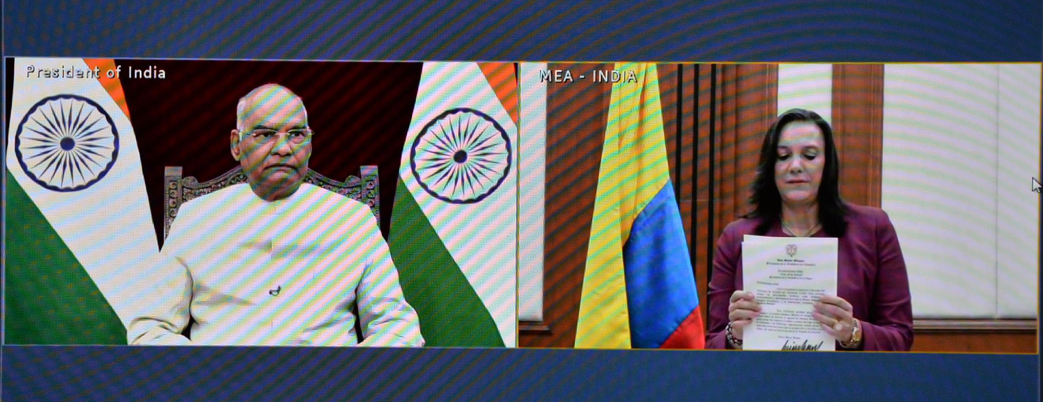 The President of India, Shri Ram Nath Kovind accepting credentials from the Ambassador of the Republic of Colombia, H.E. Ms. Mariana Pacheco Montes, in a virtual ceremony, at Rashtrapati Bhavan on July 06, 2021.