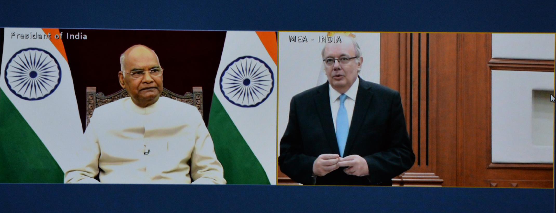 The President of India, Shri Ram Nath Kovind accepting credentials from the Ambassador of the Republic of Turkey, H.E. Mr. Firat Sunel, in a virtual ceremony, at Rashtrapati Bhavan on July 07, 2021.