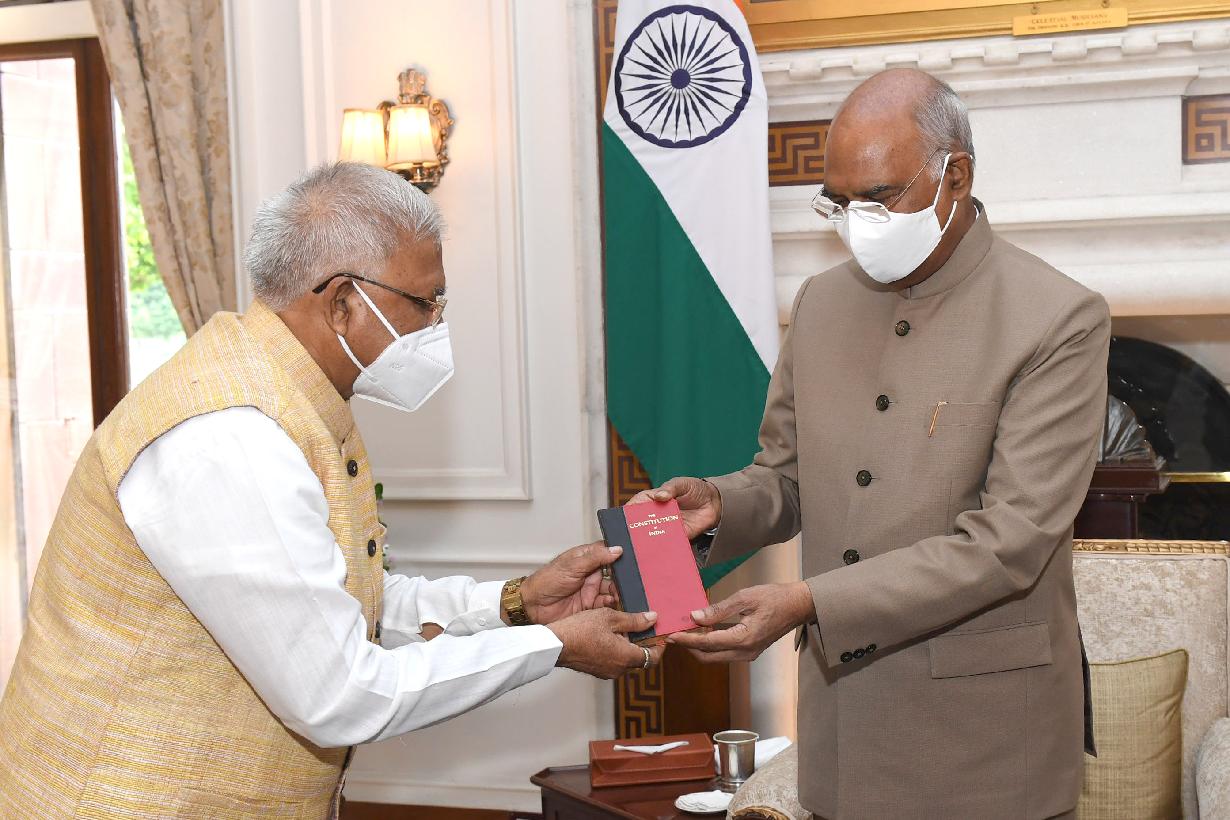 The Governor of Madhya Pradesh, Shri Mangubhai Chhaganbhai Patel calling on the President of India, Shri Ram Nath Kovind, at Rashtrapati Bhavan on July 15, 2021.