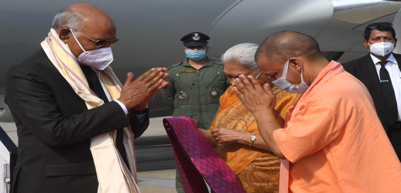 The President of India, Shri Ram Nath Kovind being received by the Governor of Uttar Pradesh, Smt. Anandiben Patel and the Chief Minister of Uttar Pradesh, Shri Yogi Adityanath, on his arrival, at Kanpur Central railway station on June 25, 2021.
