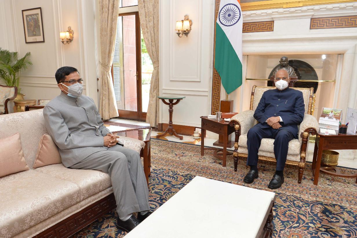 The Central Vigilance Commissioner, Shri Sanjay Kothari calling on the President of India, Shri Ram Nath Kovind, at Rashtrapati Bhavan on June 22, 2021.