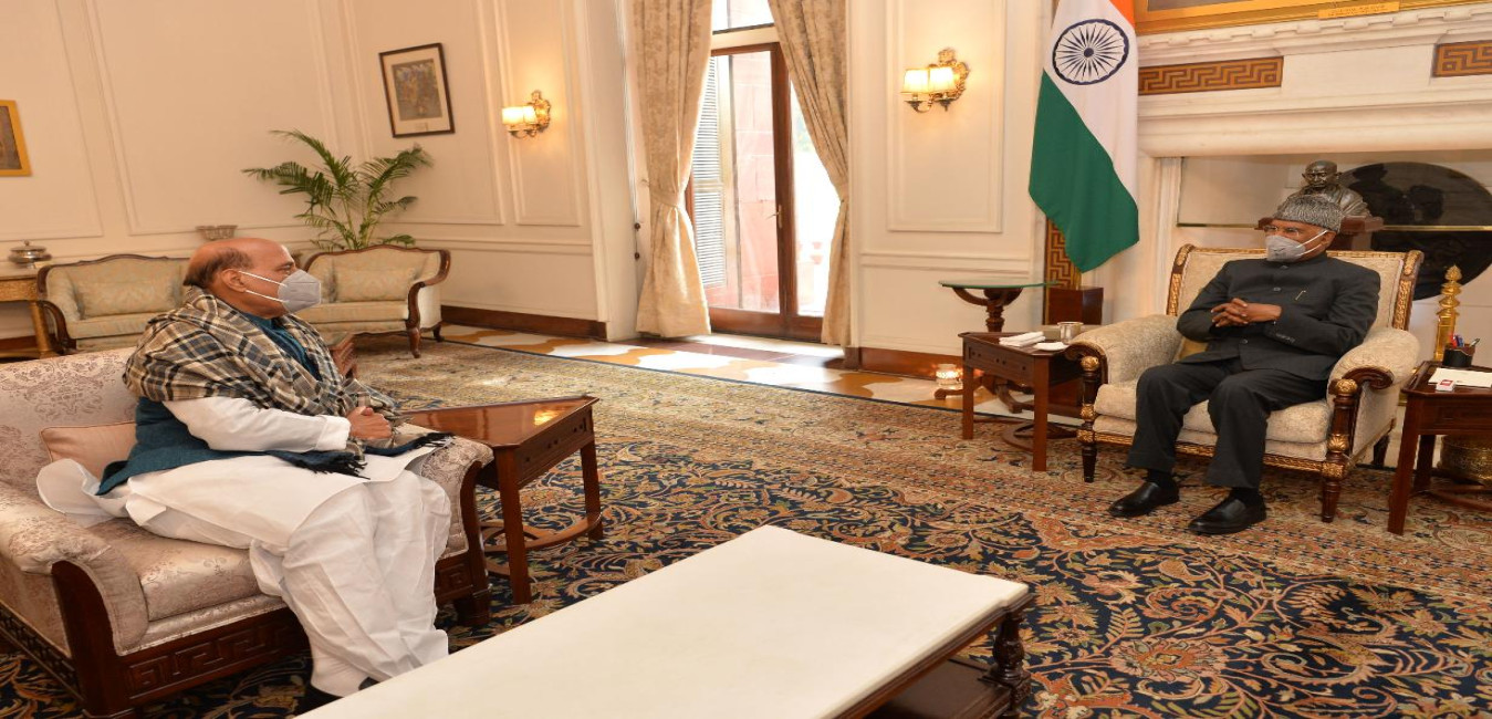 The Minister of Defence, Shri Rajnath Singh calling on the President of India, Shri Ram Nath Kovind, at Rashtrapati Bhavan on January 01, 2021.