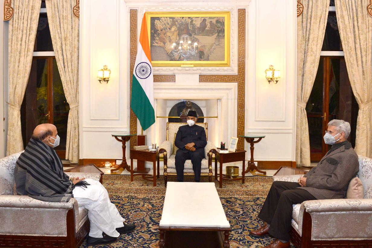 The Minister of Defence, Shri Rajnath Singh and the Minister of External Affairs, Dr. S. Jaishankar calling on the President of India, Shri Ram Nath Kovind, at Rashtrapati Bhavan on January 13, 2021.