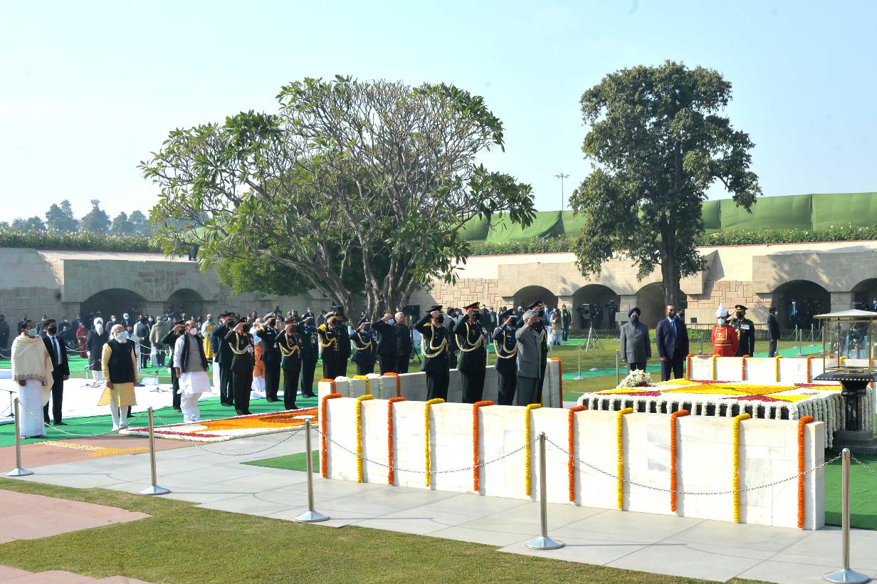The President of India, Shri Ram Nath Kovind paying tributes to Mahatma Gandhi on Martyrs Day, at Rajghat, in New Delhi on January 30, 2021.