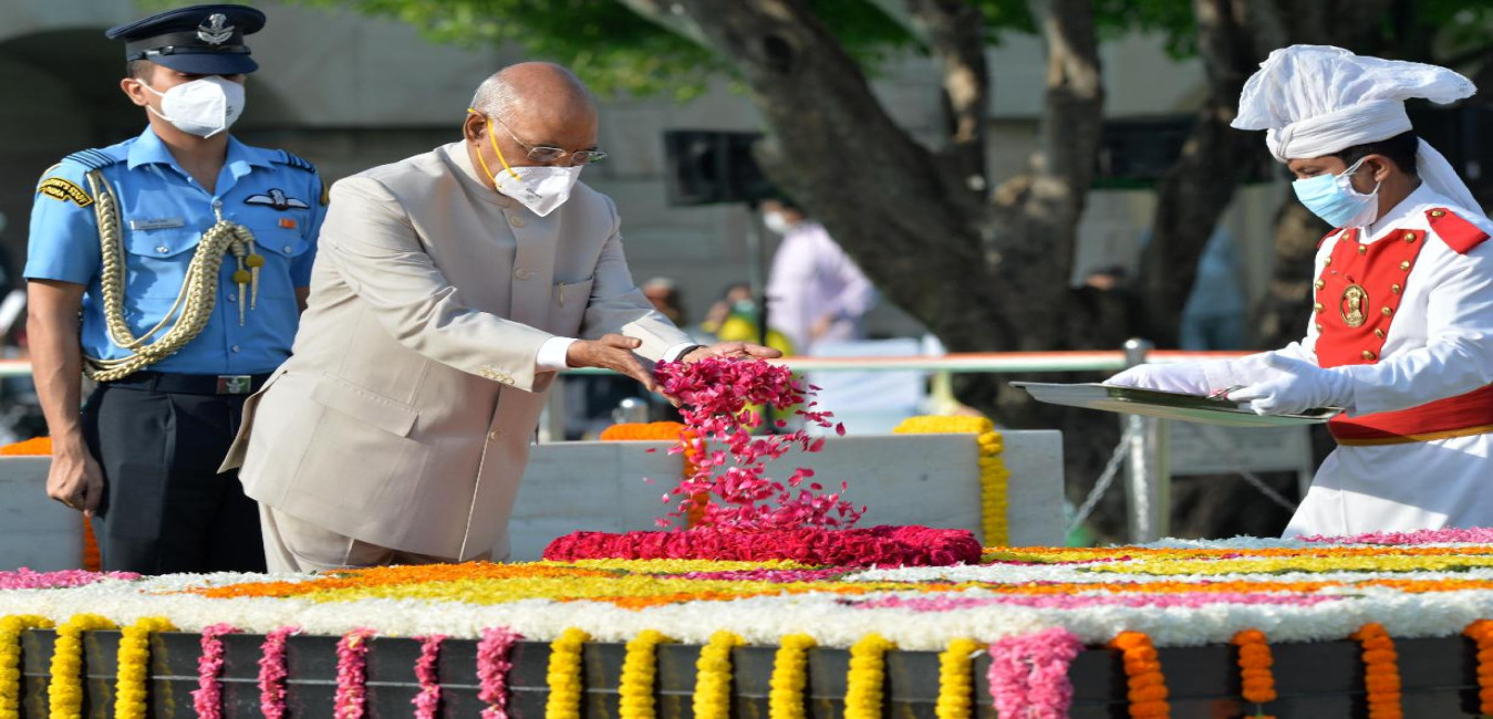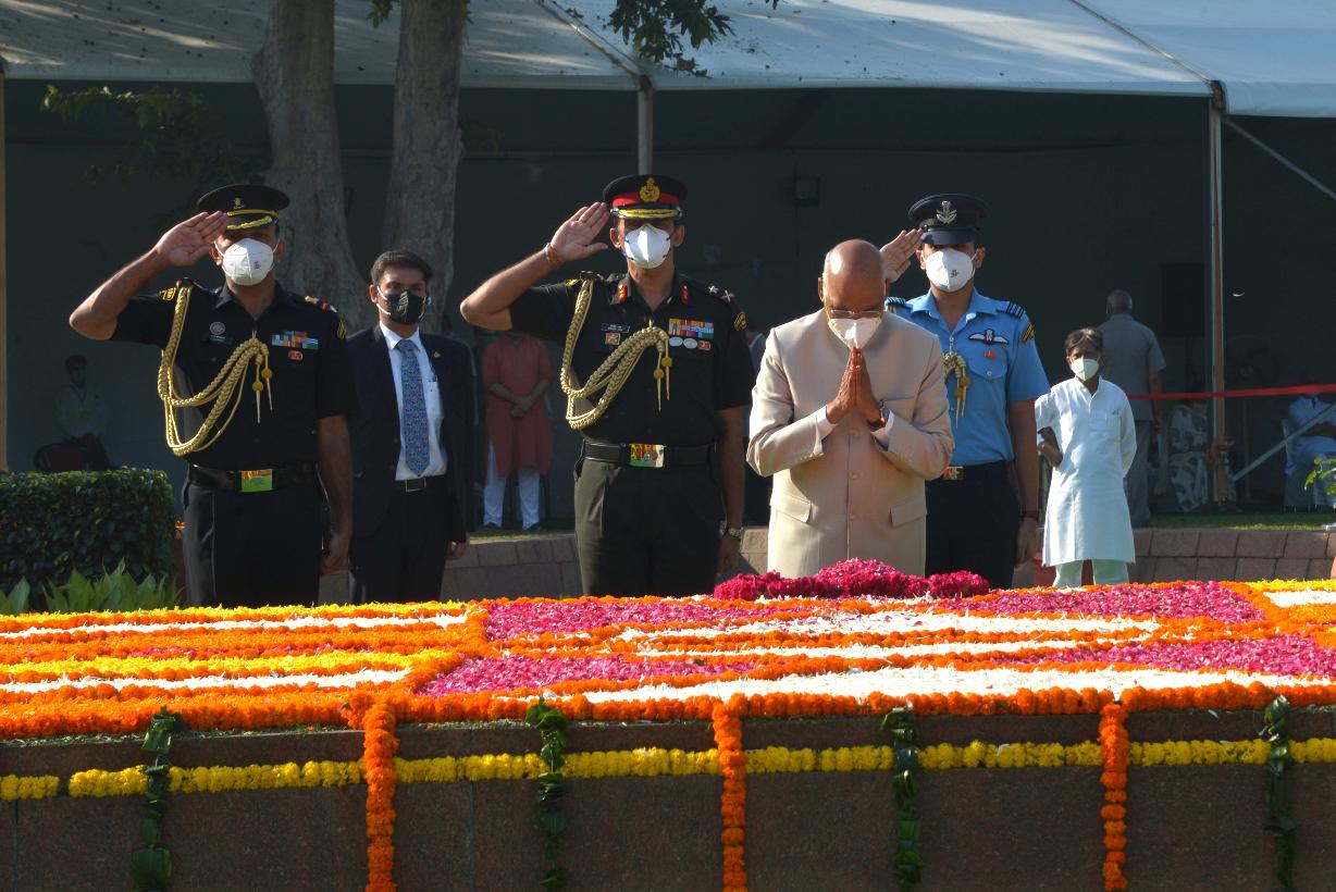 The President of India, Shri Ram Nath Kovind paying floral tributes to Mahatma Gandhi on his 151st birth anniversary, at Rajghat, in New Delhi on October 02, 2020.
