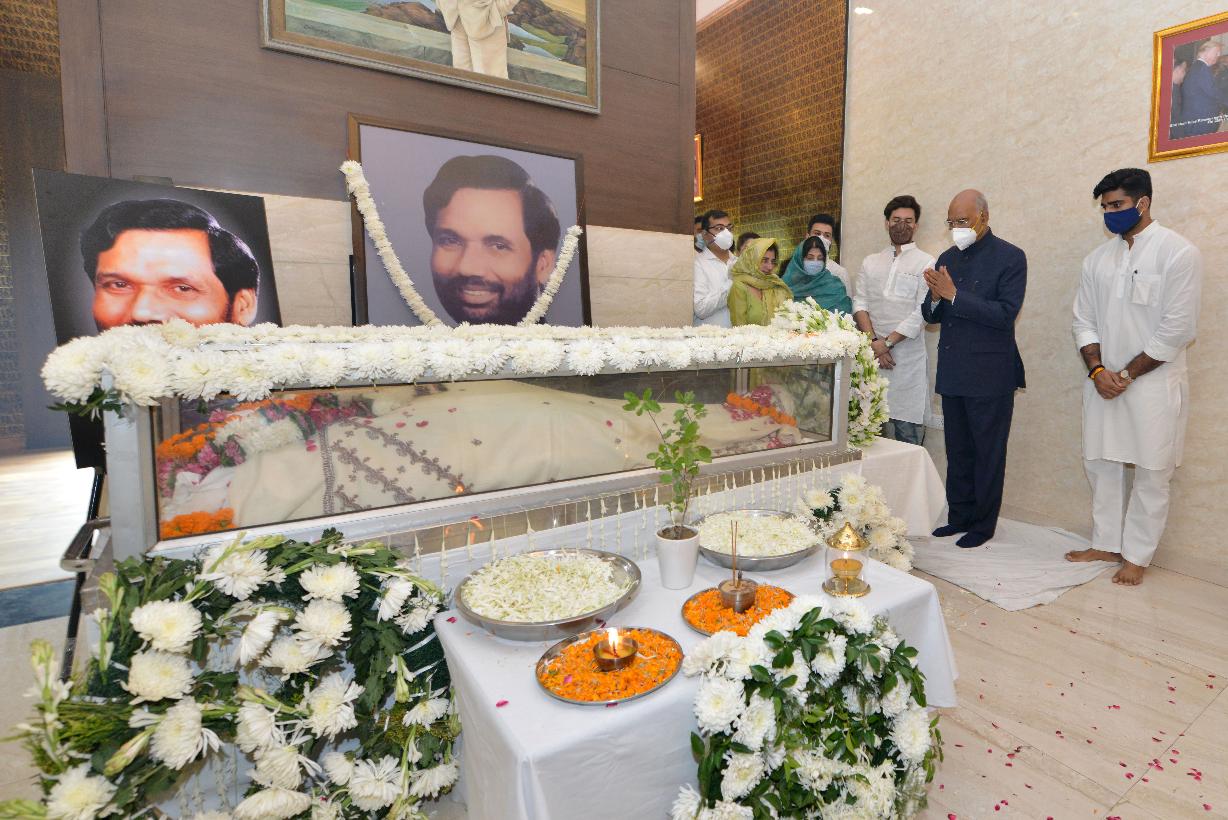 The President of India, Shri Ram Nath Kovind paying his respects to late Shri Ram Vilas Paswan, Union Minister of Consumer Affairs, Food and Public Distribution, at his residence 12, Janpath, in New Delhi on October 09, 2020.