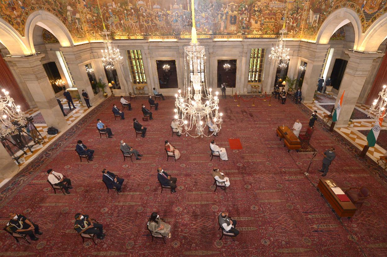 The President of India, Shri Ram Nath Kovind administering the oath of office to Shri Girish Chandra Murmu as the Comptroller and Auditor-General of India, at Rashtrapati Bhavan on August 08, 2020.