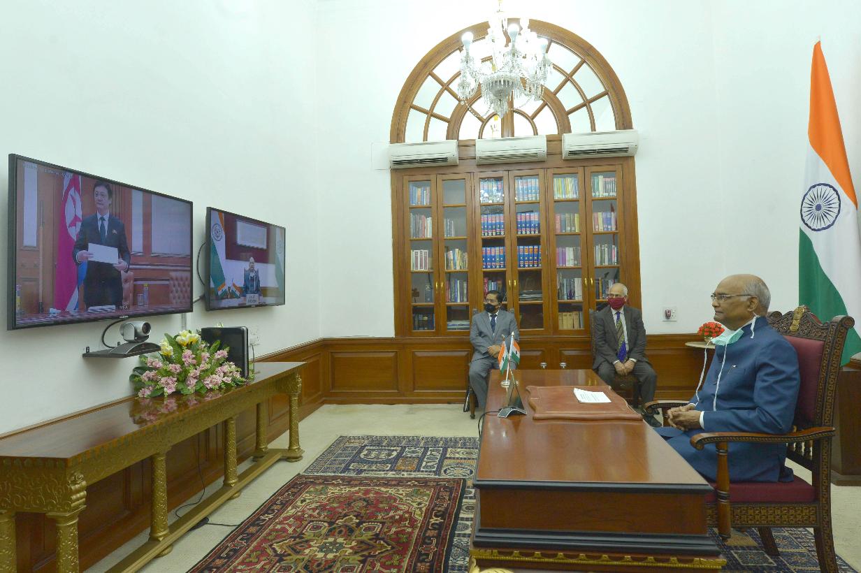 The Ambassador-designate of the Democratic People's Republic of Korea (DPRK), H.E. Mr. Choe Hui Chol presenting his credentials to the President of India, Shri Ram Nath Kovind through video conferencing, at Rashtrapati Bhavan on May 21, 2020.