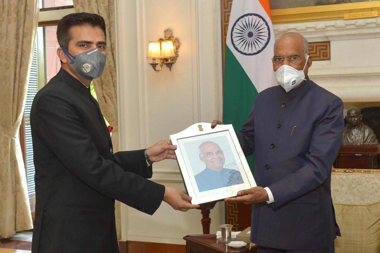 The Ambassador-designate of India to Greece, Shri Amrit Lugun calling on the President of India, Shri Ram Nath Kovind, at Rashtrapati Bhavan on June 23, 2020.