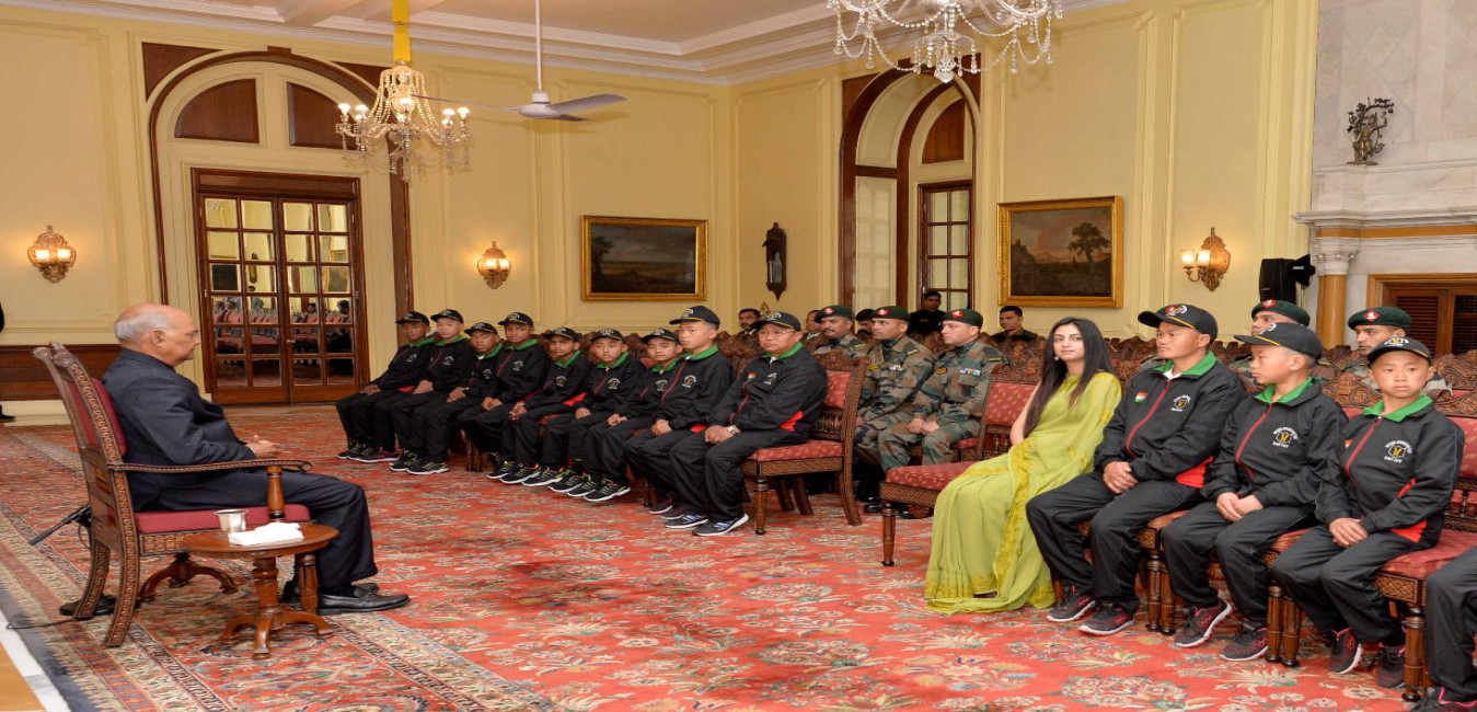 Students from Anini District of Arunachal Pradesh attending National Integration Tour, organized by 3 KUMAON (Rifles)/ HQ 3 Corps of Eastern Command meeting with the President of India, Shri Ram Nath Kovind, at Rashtrapati Bhavan on February 11, 2020.