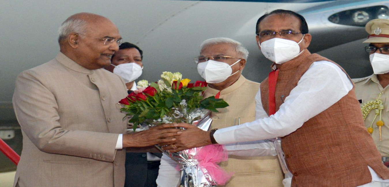 The President of India, Shri Ram Nath Kovind being received by the Governor of Madhya Pradesh, Shri Mangubhai Patel and Chief Minister, Shri Shivraj Singh Chouhan, on his arrival, in Bhopal, Madhya Pradesh on May 27, 2022.