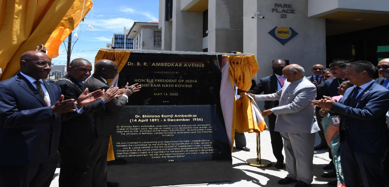 The President of India, Shri Ram Nath Kovind inaugurates Dr. Ambedkar Avenue in Downtown Kingston in honour of Babasaheb Dr. B.R. Ambedkar, in Jamaica on May 16, 2022.