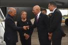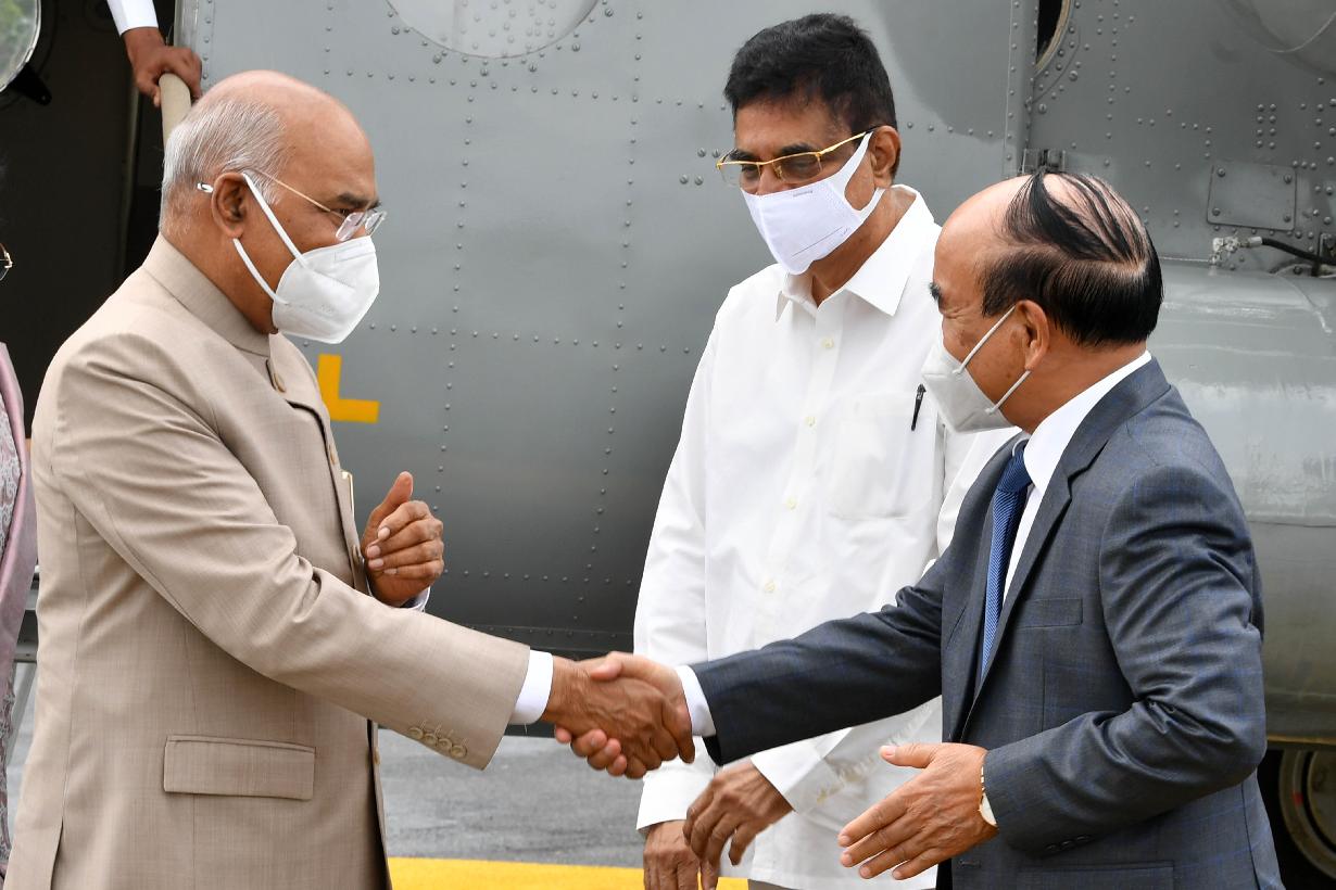 The President of India, Shri Ram Nath Kovind being received by the Governor of Mizoram, Dr. Hari Babu Kambhampati and the Chief Minister, Shri Zoramthanga, on his arrival, at Aizawl on May 05, 2022.