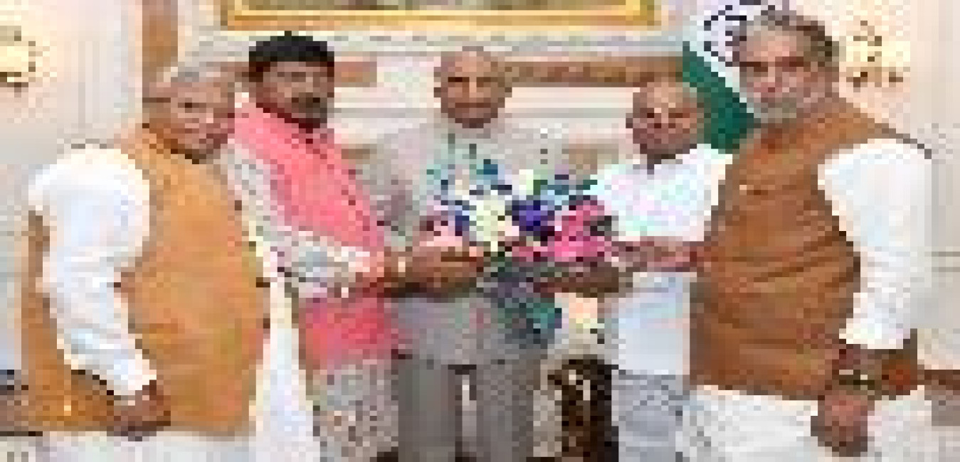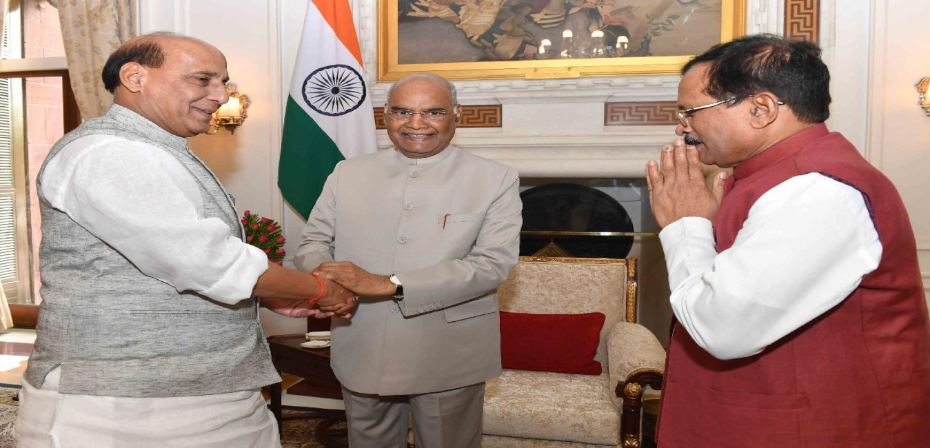 The Minister of Defence, Shri Rajnath Singh along with the Minister of State for Defence, Shri Shripad Yesso Naik meeting with the President of India, Shri Ram Nath Kovind, at Rashtrapati Bhavan on June 11, 2019.