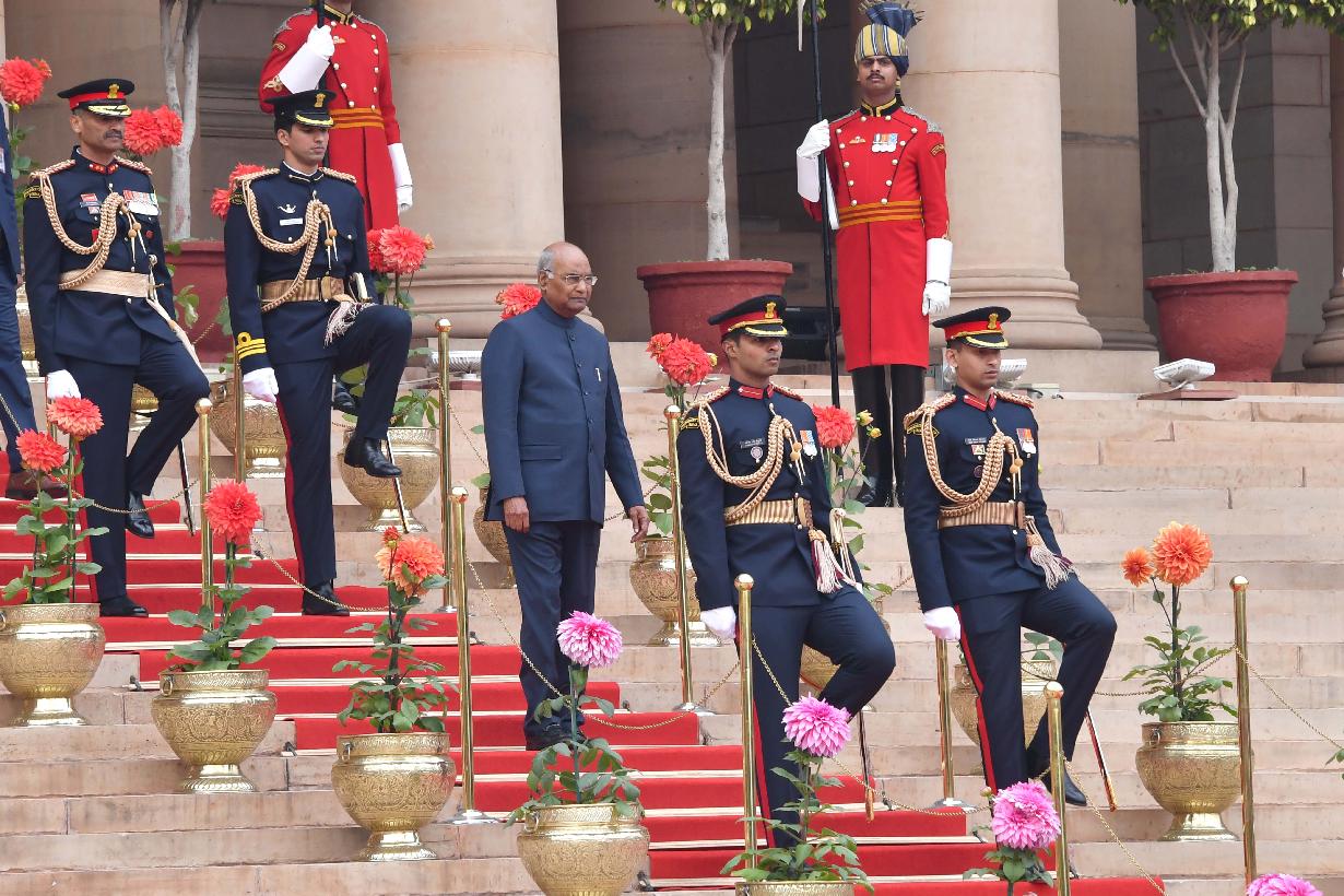The President of India, Shri Ram Nath Kovind receiving National Salute from President's Body Guard at the Forecourt of Rashtrapati Bhavan before leaving for Parliament House to address the Joint Sitting of Two Houses of Parliament, in New Delhi on January 31, 2019.