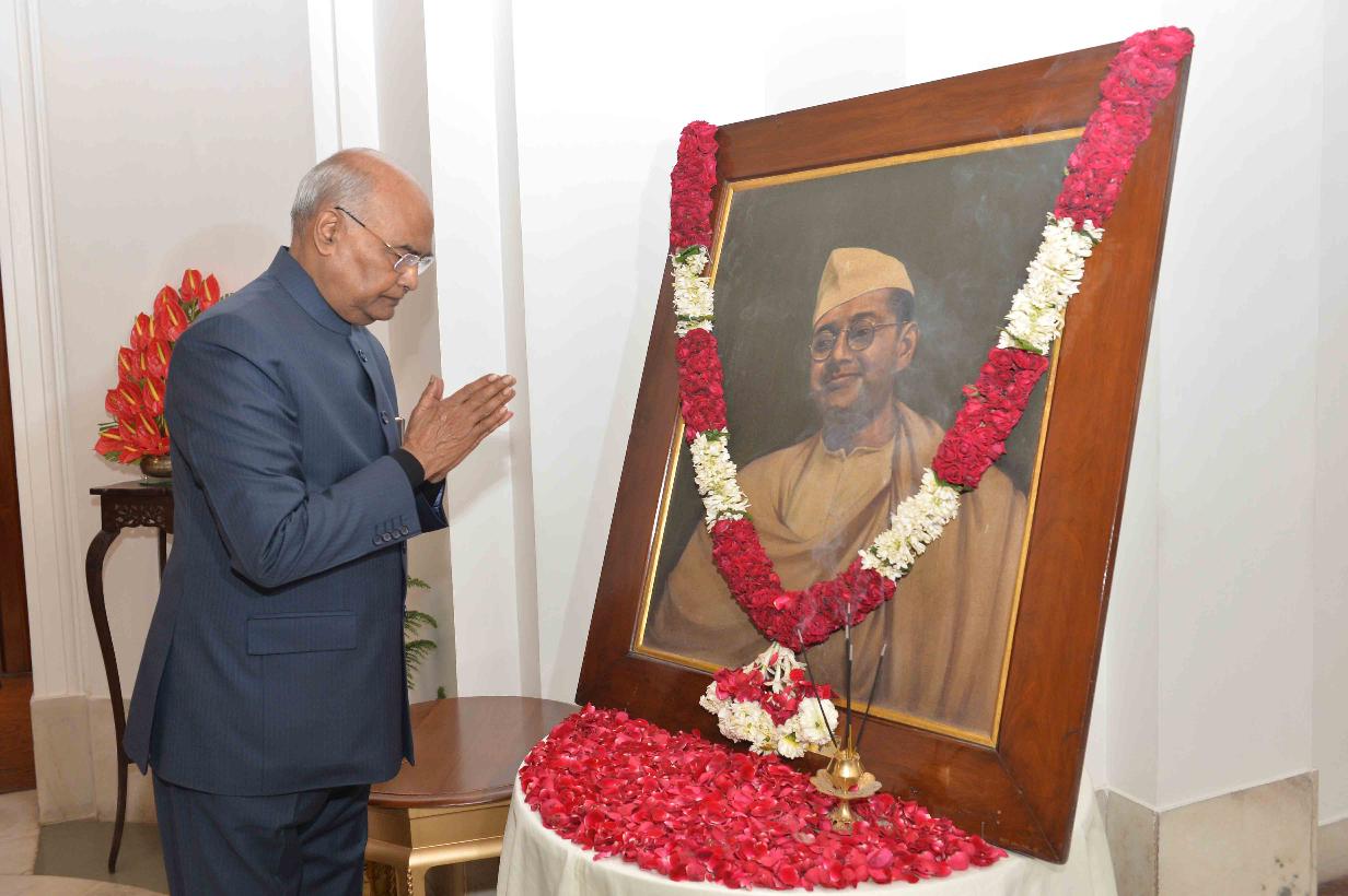 The President of India, Shri Ram Nath Kovind paying floral tributes at the portrait of Netaji Subhash Chandra Bose on his birth anniversary, at Rashtrapati Bhavan on January 23, 2019.