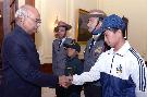 The President of India, Shri Ram Nath Kovind meeting with the students and teachers from Singngat (Manipur) and Aizawl (Mizoram), attending National Integration Tour, organised by Assam Rifles, at Rashtrapati Bhavan on January 14, 2019.
