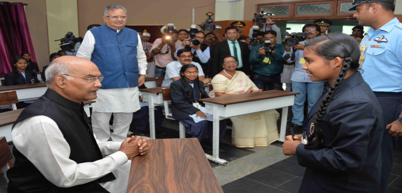The President of India, Shri Ram Nath Kovind interacting with the students at Astha Vidya Mandir, Shri Atal Bihari Vajpayee Education City, at Jawanga, Dantewada, in Chhattishgarh on July 25, 2018.