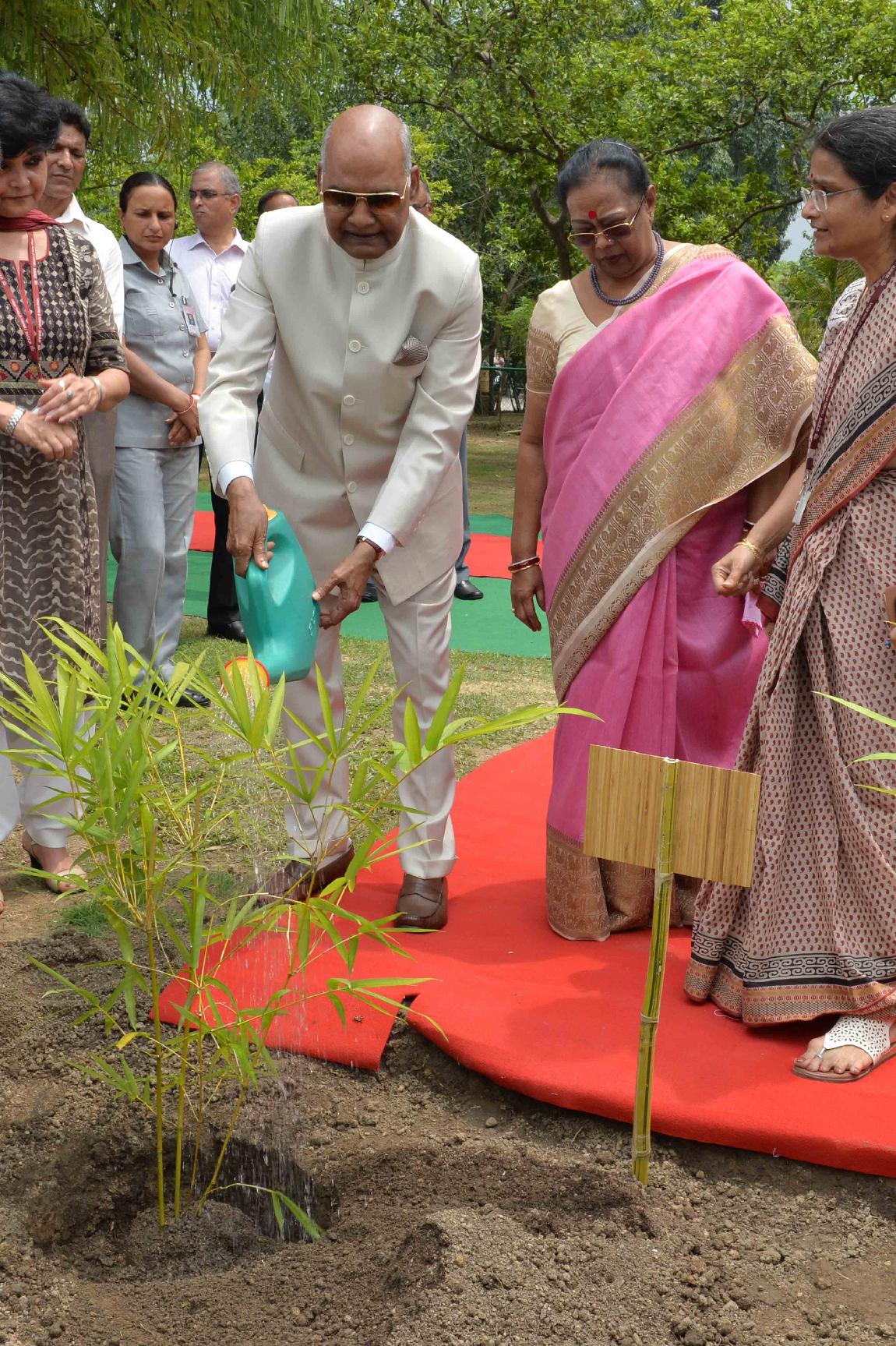The President of India, Shri Ram Nath Kovind and First Lady of India, Smt. Savita Kovind planting the Aroma Plant, Bamboo and Gulmohar Sapling on the occasion of "Van Mahotsav", at President's Estate, in New Delhi on July 16, 2018.