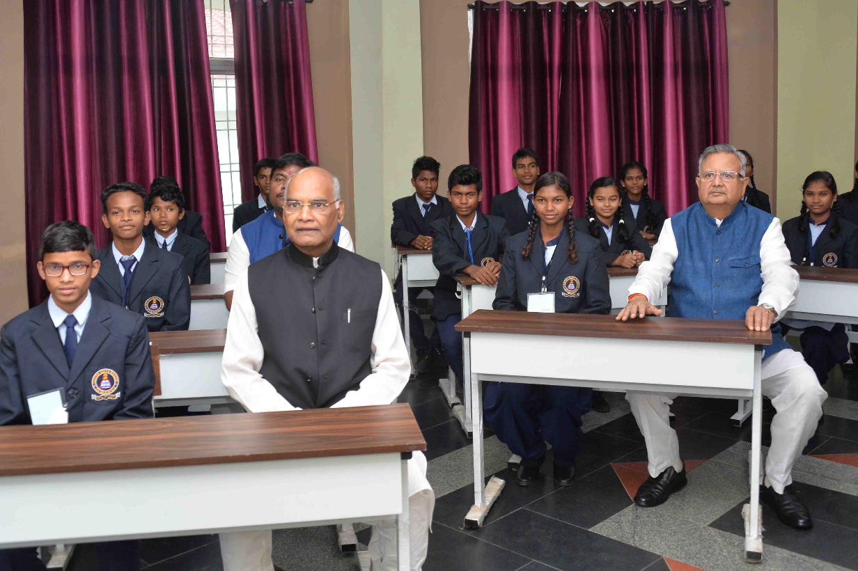 The President of India, Shri Ram Nath Kovind interacting with the students at Astha Vidya Mandir, Shri Atal Bihari Vajpayee Education City, at Jawanga, Dantewada, in Chhattishgarh on July 25, 2018.