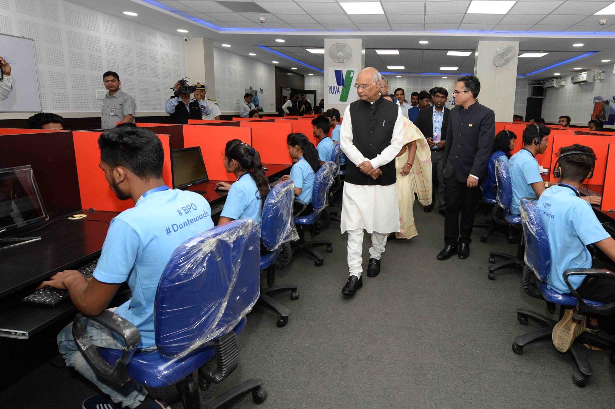 The President of India, Shri Ram Nath Kovind inaugurates the BPO and interacts with the employees, at YUVA BPO, Shri Atal Bihari Vajpayee Education City, at Jawanga, Dantewada, in Chhattishgarh on July 25, 2018.