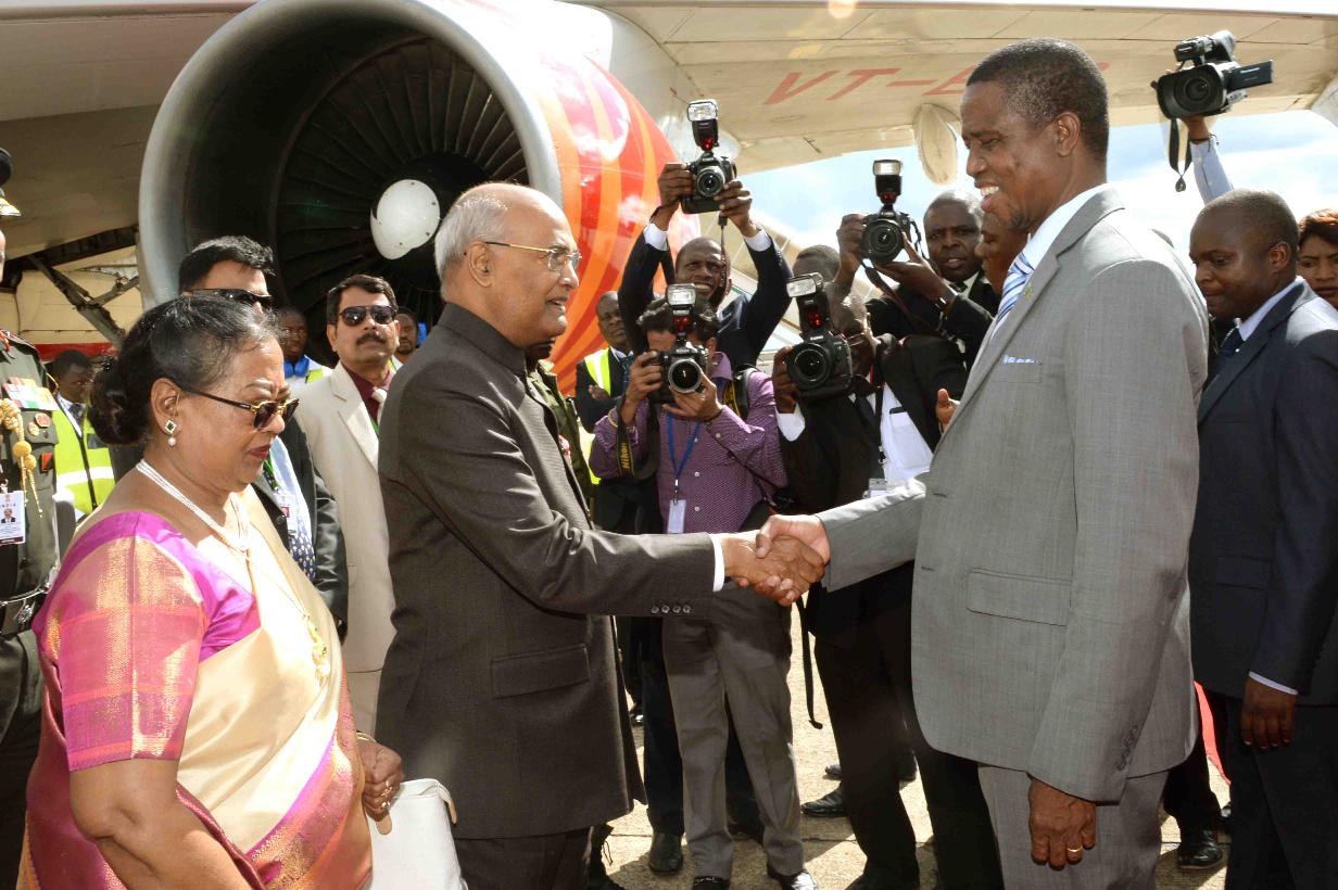 The President of India, Shri Ram Nath Kovind being received by the President of the Republic of Zambia, H.E. Mr. Edgar Chagwa Lungu and other dignitaries, on his arrival, at Kenneth Kaunda International Airport, Lusaka, in the Republic of Zambia on April 10, 2018.