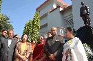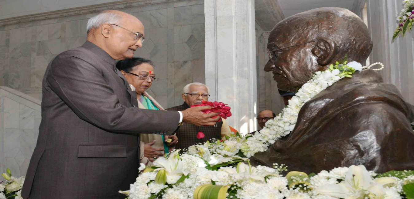 The President of India, Shri Ram Nath Kovind paying floral tributes at the bust of Mahatma Gandhi during the foundation stone laying ceremony for "Naya-Gram" Project of High Court of Allahabad, in Uttar Pradesh on December 16, 2017.