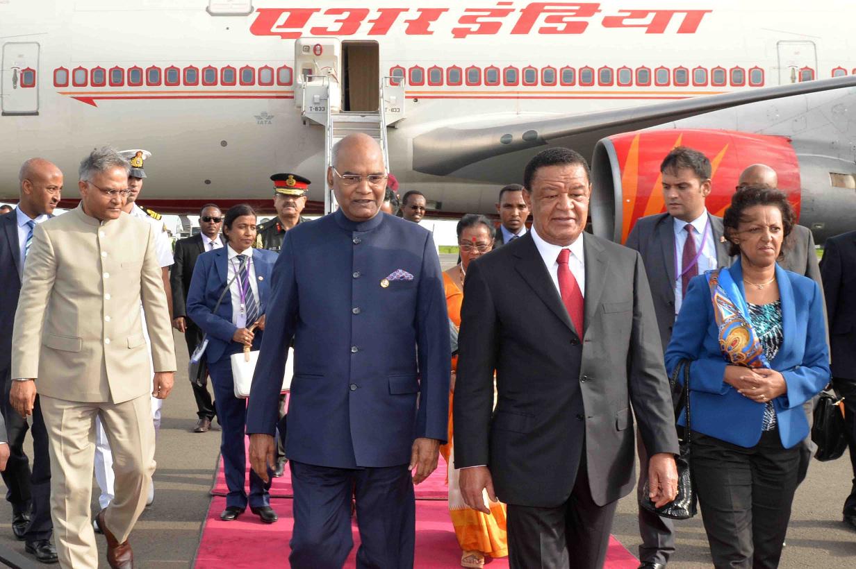 The President of India, Shri Ram Nath Kovind being received by the President of Ethiopia, H.E. Dr. Mulatu Teshome, on his arrival, at Addis Ababa Bole International Airport, in Ethiopia on October 04, 2017.