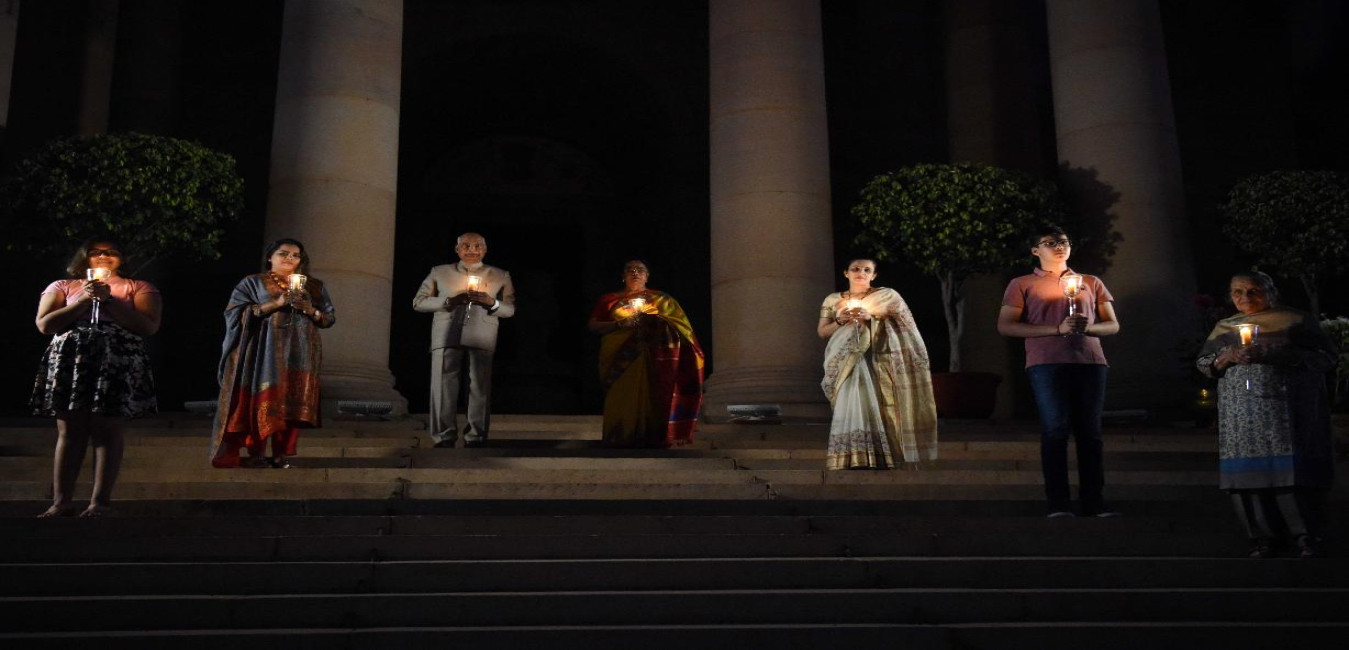 The President of India, Shri Ram Nath Kovind with the First Lady and members of the family joined fellow citizens in demonstrating collective solidarity and positivity by lighting candles on 9 PM, at Rashtrapati Bhavan on April 05, 2020. He expressed his gratitude towards every Indian for showing resolve & resilience in the fight against COVID-19.