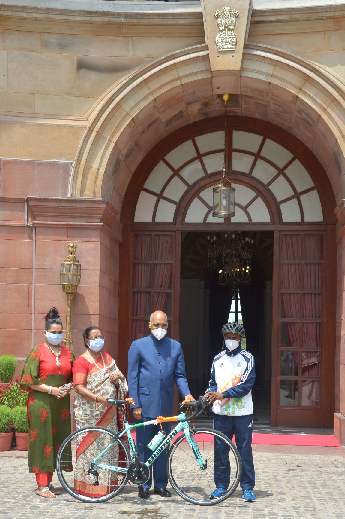 The President of India, Shri Ram Nath Kovind gifting a racing bicycle to a struggling school boy Riyaz, who dreams of excelling as cyclist, at Rashtrapati Bhavan on July 31, 2020.
