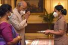 The President of India, Shri Ram Nath Kovind celebrates Raksha Bandhan with nurses of The Trained Nurses' Association of India, Military Nursing Service and President's Estate Clinic, at Rashtrapati Bhavan on August 03, 2020.