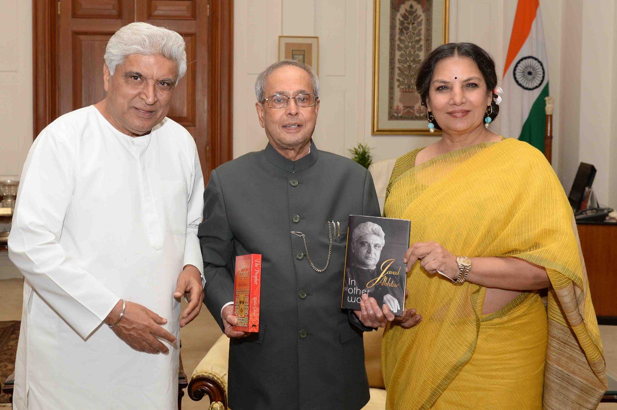 The President of India, Shri Pranab Mukherjee meeting with Shri Javed Akhtar, Ex-MP (RS) and Smt. Shabana Azmi, at Rashtrapati Bhavan on May 18, 2016.