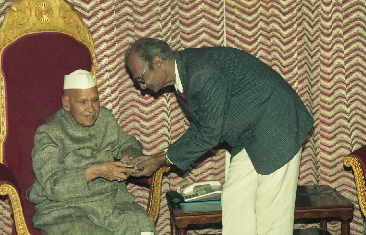 The President of India, Dr. Shankar Dayal Sharma receiving a Audio Cassette "Piyaz Ke Chhilke" from Shri Abdul Qadeer Khan with others, at Rashtrapati Nilayam, in Secunderabad, Andhra Pradesh on November 03, 1996.