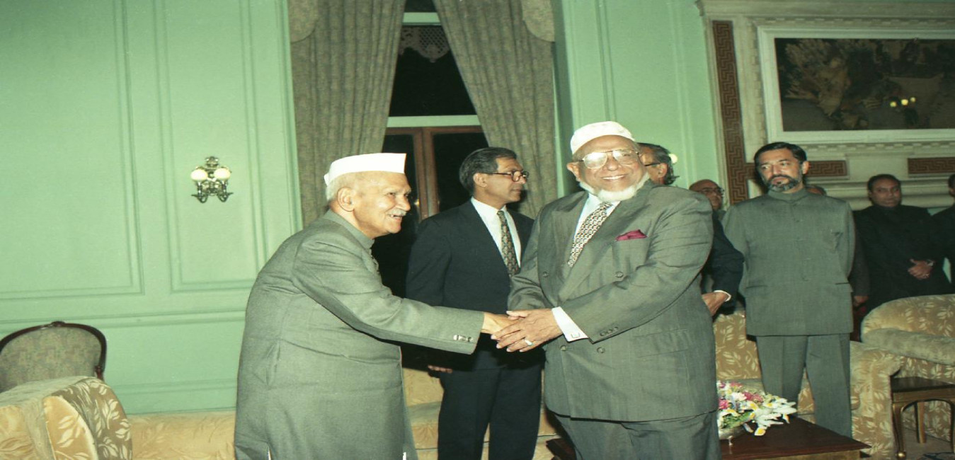 The President of India, Dr. Shankar Dayal Sharma meeting with the Foreign Minister of Bangladesh, Mr. Abdus Samad Azad at Rashtrapati Bhavan in New Delhi on March 12, 1997.