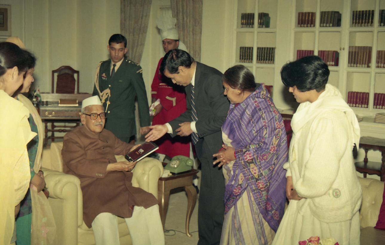 The President of India, Dr. Shankar Dayal Sharma receiving a copy of the book from Smt. Bandita with others at Rashtrapati Bhavan in New Delhi on January 20, 1996.
