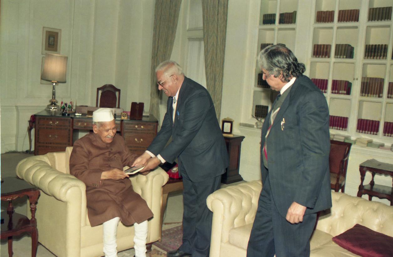 The President of India, Dr. Shankar Dayal Sharma receiving a copy of the book from Shri C.K. Sardana with others at Rashtrapati Bhavan in New Delhi on February 22, 1995.