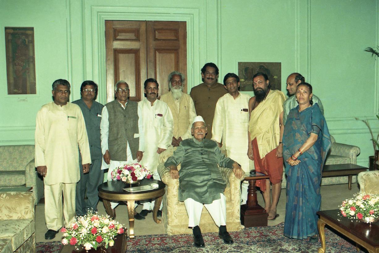 The President of India, Dr. Shankar Dayal Sharma meeting with Shri Dileep Singh Judev, MP(LS) with others MPs & Freedom Fighters from Chhatisgarh at Rashtrapati Bhavan in New Delhi on March 13, 1997.